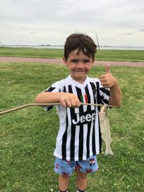 En realidad ellos juegan en la playa mientras nosotros estamos esperando que pique algo y cuando pica los hacemos sacarlos y que no se aburran con toda la espera. Ellos mientras hacen castillos de arena, se meten al agua, y cuando pica algo ahí se acercan a ayudarnos.
