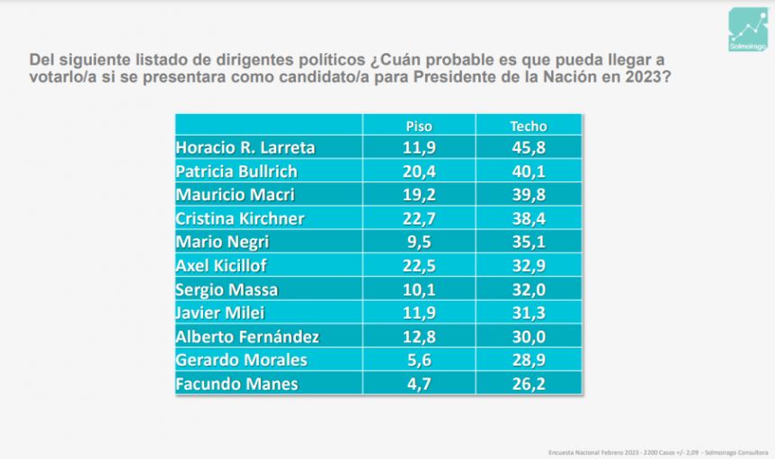 La consultora Solmoirago dio a conocer un nuevo estudio que analiza los mejor posicionados en la carrera de cara a las elecciones de este año. El relevamiento fue realizado en la República Argentina, a nivel nacional del 10 al 16 de febrero de 2023.