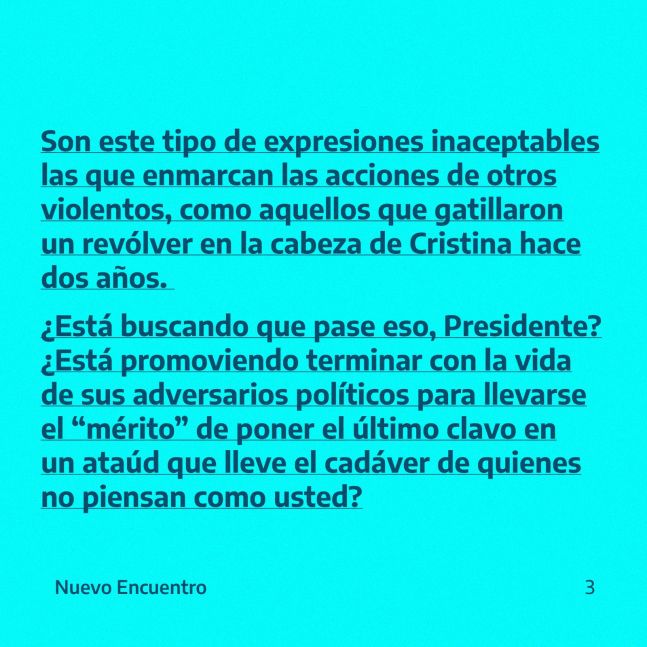 Otra organización política que repudió las palabras de Javier Milei contra la expresidenta Cristina Kirchner fue Nuevo Encuentro, conducida por Martín Sabatella. Allí destacaron: “La violencia y el odio que emana permanentemente en su discurso no son aceptables en una sociedad democrática., ni pueden ser toleradas a quien detenta el cargo de mayor responsabilidad institucional del país”.Repudiamos estas declaraciones del presidente @JMilei y su gobierno libertario. Basta de destilar odio. Basta de violencia económica, de descargar su ira y sus frustraciones sobre el pueblo trabajador, la clase media, los jubilados y los docentes y estudiantes universitarios.… pic.twitter.com/cqk16ZOHC6