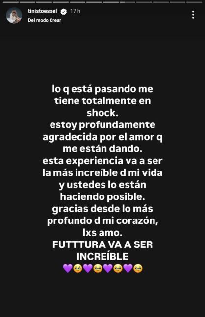 “Lo que está pasando me tiene totalmente en shock, estoy profundamente agradecida por todo el amor que me están dando”, escribió Martina en una historia que subió a su Instagram.