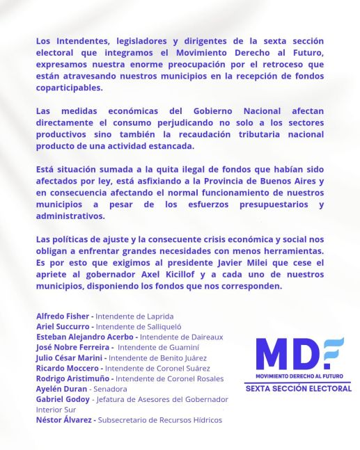 “Los intendentes, legisladores y dirigentes de la sexta sección electoral que integramos el Movimiento Derecho al Futuro expresamos nuestra enorme preocupación por el retroceso que están atravesando nuestros municipios en la recepción de fondos coparticipables”, manifestaron. “Las medidas económicas del Gobierno Nacional afectan directamente el consumo perjudicando no solo a los sectores productivos sino también la recaudación tributaria nacional producto de una actividad estancada.”