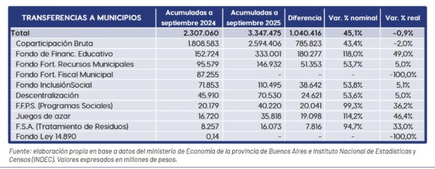 En números absolutos, los municipios recibieron 3,35 billones de pesos, de los cuales el 77% correspondió a coparticipación y el 23% a fondos con destino específico. Entre estos últimos, el de mayor incidencia fue el educativo, que duplicó sus montos respecto de 2024 .