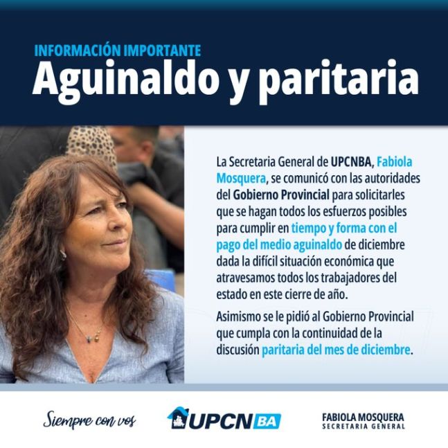 En tal sentido, la organización de empleados estatales remarcó que su secretaria General, Fabiola Mosquera, se dirigió al Gobierno provincial para que “se hagan todos los esfuerzos posibles para cumplir en tiempo y forma" con el pago del aguinaldo, que debería cobrarse el próximo 18 de este mes.