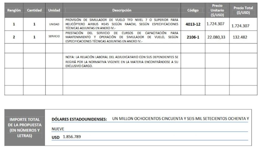 La adjudicación de un simulador de vuelo para entrenar a los s de las Tripulaciones de la Provincia vuelve a poner bajo la lupa los criterios de contratación del Ministerio de Seguridad. Según la orden de compra del proceso 179-0546-LPU25, la Provincia pagará USD 1.724.307 por un equipo de simulación del helicóptero EC-145, más un curso de capacitación de USD 22.080, totalizando un contrato cercano a los USD 1,75 millones (más de $2.357 millones).