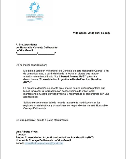 Horas atrás, nació en Villa Gesell el primer bloque de ese espacio, luego de que el edil Luis Vivas anunciase que dejaba de integrar la bancada “La Libertad Avanza UVG” para conformar el unibloque “Consolidación Argentina-Unidad Vecinal Gesellina”.