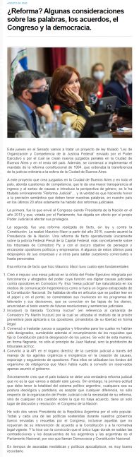 "La segunda, fue una reforma realizada de facto, sin ley y contra la Constitución. La realizó Mauricio Macri a partir del año 2015, cuando asumió la Presidencia de la Nación. Una reforma de facto operativizada únicamente sobre la justicia Federal Penal de la Capital Federal, más concretamente sobre los tribunales de Comodoro Py, y con el oscuro objetivo de perseguir y encarcelar opositores políticos y empresarios. A algunos de estos últimos para despojarlos de sus empresas y a otros para saldar cuestiones comerciales o hasta personales" criticó.