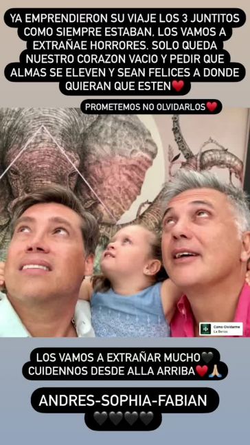 La actriz grabó unos videos para sus historias de Instagram y narró: "Nos acaban de confirmar que apareció el cuerpo de Fabián. Le pedimos mucho respeto por los tres. Gracias a Dios están juntitos y deseamos que sus almas se eleven y que pasen a una vida mejor. Los vamos a extrañar mucho". Además, en su posteo Morena le envió todo su apoyo a su amiga Jackie, quien en las redes la presentó como su "mami". "Sabes que te quiero mucho y aunque esté en la Argentina, estoy allá con vos".