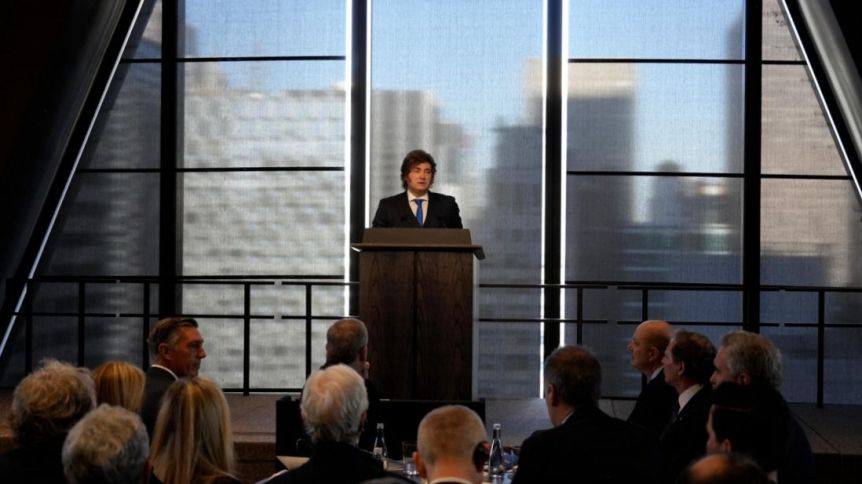 Milei, que se encuentra en el país del Norte en una gira que comprende diversas actividades, entre las que ya figuraron un encuentro con el presidente estadounidense Donald Trump y la aceptación de un premio en la Universidad Yeshiva, fue el encargado de dejar inaugurado el evento semanal que organizan la Embajada argentina en aquel país y los bancos JP Morgan y Bank of America.