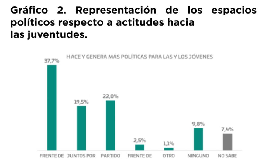 Según la investigación de la encuestadora “el Frente de Todos sigue primero entre las percepciones de representación política del segmento, pero con muchísima menos potencia que hace cuatro años. El oficialismo no debe olvidar que fue el voto joven el que le permitió ganar en primera vuelta en 2019. Hoy es posiblemente el segmento en el que más espacio perdió.