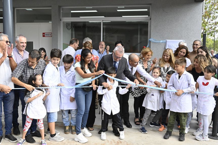 El intendente de Tigre recorrió el establecimiento junto a la comunidad educativa y autoridades presentes. Entre los trabajos realizados se destacan la construcción de tres aulas, una biblioteca, cinco módulos de baño que incluyen uno para personas con discapacidad, sala de dirección y secretaría, depósito y SUM-Comedor.