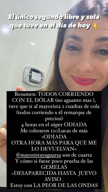 Luego, procedió a dar detalles del motivo de su mal humor: "Ya me fastidia ir al mayorista... ustedes no entienden, me hizo acordar a la pandemia... dos cuadras de cola para pagar. Estuve una hora y media, dos en la cola". La modelo decidió ir a comprar provisiones para ganarle a la inflación por la suba del dólar y se encontró con muchas otras personas en la misma situación, por lo que tuvo que esperar más tiempo que de costumbre.