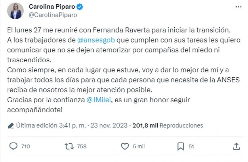 La noticia fue confirmada por Clarín y llamó la atención debido a que la propia Píparo había informado este jueves que el próximo 27 de noviembre tenía una reunión con Fernanda Raverta, actual titular de Anses, para acordar los mecanismos de la transición y había enviado un mensaje a los trabajadores.