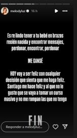 “Es re lindo tener a tu bebé en brazos, recién nacida y encontrar mensajes, perdonar, encontrar, perdonar”. Luego, en mayúsculas, añadió una oración muy corta, pero contundente: "Me cansé”.