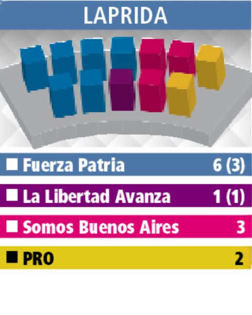 Los resultados electorales provocaron nuevos reacomodamientos en el Deliberante de Laprida. Fuerza Patria tendrá 6 concejales propios y la oposición se reparte la otra mitad de bancas. El PRO tendrá 2 bancas, la UCR se reduce a 3 escaños y La Libertad Avanza se suma a la nueva composición con 1 lugar.