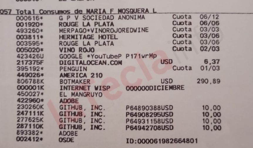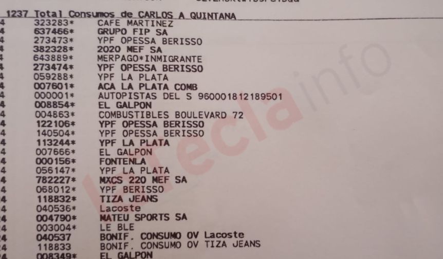 Entre los consumos detectados en los resúmenes se registran compras de vinos, perfumes y artículos de lujo, así como el pago de una cobertura médica privada de alta gama (OSDE) correspondiente a Fabiola Mosquera, quien habría abandonado la obra social estatal IOMA.