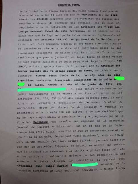 El dirigente también relató haber sido víctima de amenazas y hostigamiento. Según su testimonio, fue abordado violentamente en un café de City Bell por Juan Pablo Martín Oyarzábal, secretario gremial y uno de los hombres de confianza de Mosquera.