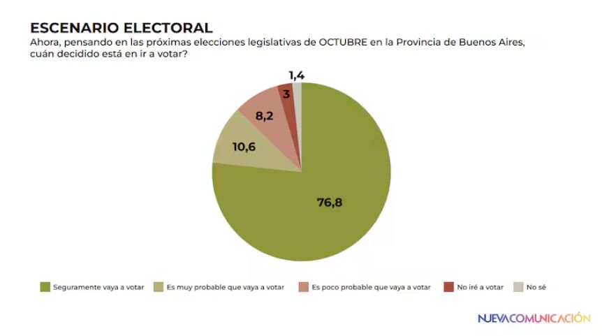 El relevamiento muestra un electorado movilizado: 76,8% de los consultados afirmó que “seguramente” irá a votar y 10,6% dijo que es “muy probable” que lo haga. Solo 3% aseguró que no concurrirá a las urnas y 1,4% respondió que aún no lo sabe.