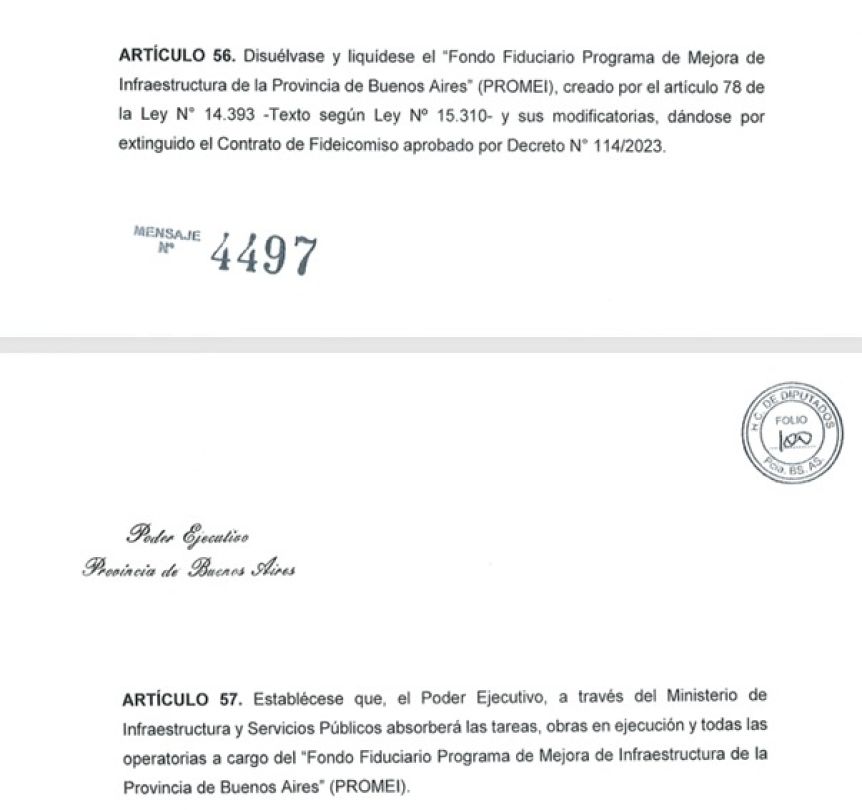 Según el texto oficial, el artículo 56 dispone la disolución y liquidación del “Fondo Fiduciario Programa de Mejora de Infraestructura de la Provincia de Buenos Aires (PROMEI)”, creado por la Ley N° 14.393 y modificado por la Ley N° 15.310. De esta manera, queda extinguido el contrato de fideicomiso aprobado por el Decreto N° 114/2023.