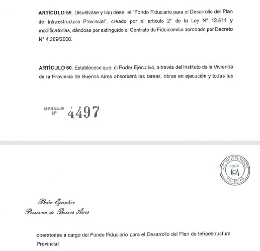 A su vez, el artículo 59 ordena la disolución y liquidación del “Fondo Fiduciario para el Desarrollo del Plan de Infraestructura Provincial”, creado por la Ley N° 12.511, y extingue el contrato de fideicomiso aprobado por el Decreto N° 4.269/2000.