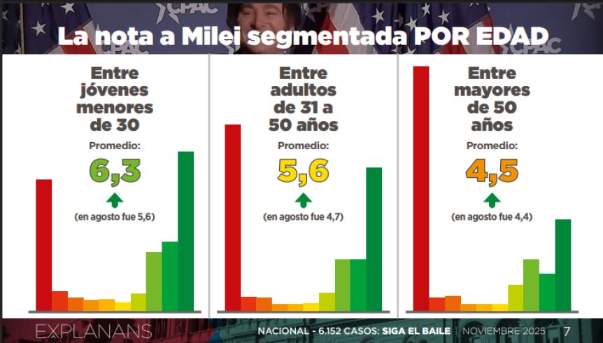 Otro punto que destaca el informe es la persistente grieta generacional, que se profundiza a medida que avanza la gestión. Mientras los menores de 30 años muestran un promedio de 6,3 puntos en la nota al gobierno, los mayores de 50 apenas alcanzan los 4,5. Los autores del estudio remarcan que esta brecha no sólo se repite en cada medición, sino que parece ya consolidada como un patrón estable.