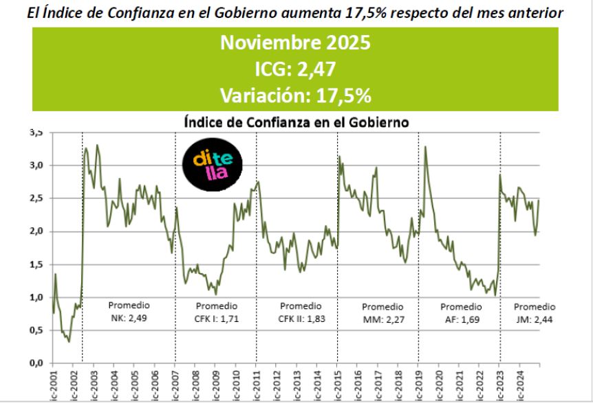 La Escuela de Gobierno de la Universidad Torcuato Di Tella difundió el Índice de Confianza en el Gobierno (ICG) correspondiente al mes de noviembre noviembre, que marcó 2,47 puntos, un nivel que implica una suba mensual del 17,5% y se convierte en la cifra más alta desde febrero de este año.
