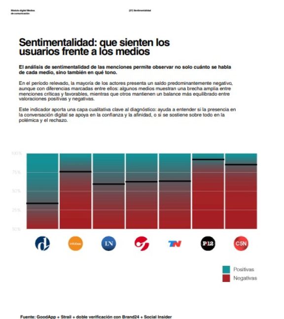 La sentimentalidad también es reveladora: la mayoría de los medios presenta predominio de menciones negativas, aunque con intensidades muy diferentes según su audiencia y su línea editorial.