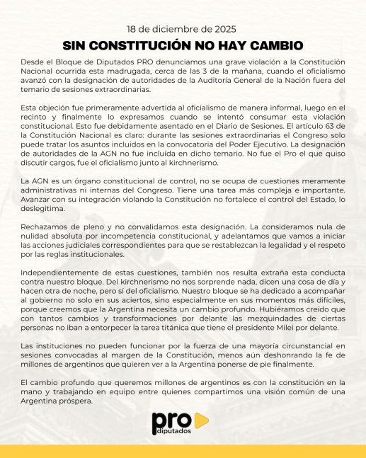 Según el comunicado difundido este 18 de diciembre, la maniobra se concretó cerca de las 3 de la mañana y, de acuerdo al PRO, vulneró de manera directa el artículo 63 de la Constitución, que establece que durante las sesiones extraordinarias el Congreso solo puede tratar los asuntos expresamente incluidos en la convocatoria del Poder Ejecutivo. La designación de autoridades de la AGN no figuraba en ese temario.