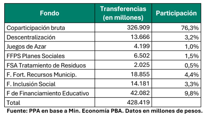 Del total girado en octubre, el 76,3% correspondió a coparticipación de impuestos, el 9,8% al Fondo de Financiamiento Educativo y el 4,4% al Fondo de Fortalecimiento de Recursos Municipales. El resto se distribuyó entre programas y fondos de menor peso relativo. El problema, advierten desde los distritos, no es solo cuánto llega, sino cómo llega.