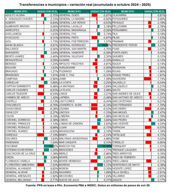 Pese al fuerte aumento nominal de los envíos de fondos, los municipios bonaerenses volvieron a perder contra la inflación y cerraron octubre con menos recursos reales y menor margen de maniobra financiera. Según datos oficiales, en octubre de 2025 la Provincia de Buenos Aires transfirió $428.419 millones a los gobiernos locales, un 28,3% más que en el mismo mes de 2024. Sin embargo, con una inflación interanual del 31,3%, las transferencias registraron una caída real del 2,32%.