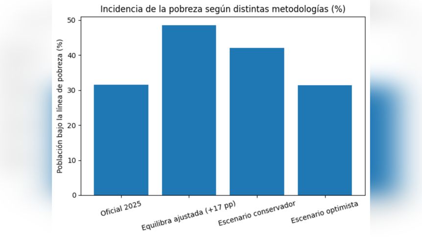 El informe de Equilibra plantea que, si la canasta básica se ajustara con datos actualizados de gasto poblacional, la incidencia de pobreza calculada sería 17 puntos porcentuales superior a la cifra oficial reportada en 2025.