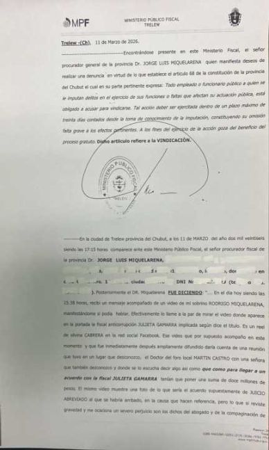 El procurador general, Jorge Miquelarena, se presentó ante la Fiscalía de Trelew y solicitó la apertura de una investigación tras la difusión de una cámara oculta en redes sociales que sugiere el pago de dinero para acordar el pedido de una condena judicial