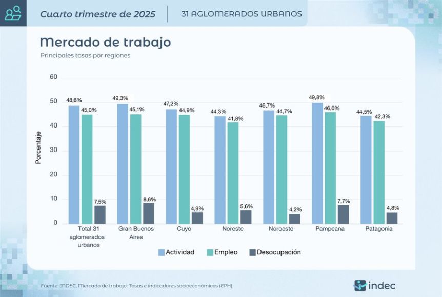 En tanto, los aglomerados urbanos que tienen menor nivel de desempleo son Santiago del Estero–La Banda (0,6%), Viedma–Carmen de Patagones (1,3%), el Gran San Luis (1,5%), Jujuy-Palpalá (2,2%) y Neuquén-Plottier (2,3%).